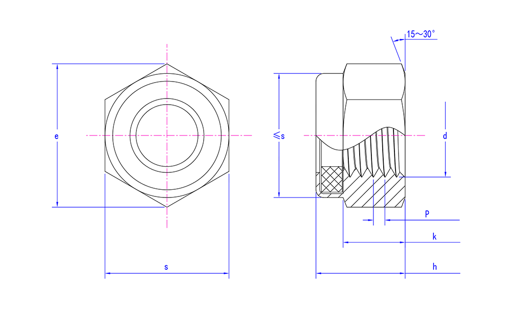 | Voordelen en functies | Intern met inzetstukken van niet-metalen materiaal, zoals nylon ringen, om de wrijving en de vergrendelingskracht te verbeteren Wordt gebruikt voor het bevestigen van verbindingen om losraken en trillingen te voorkomen |