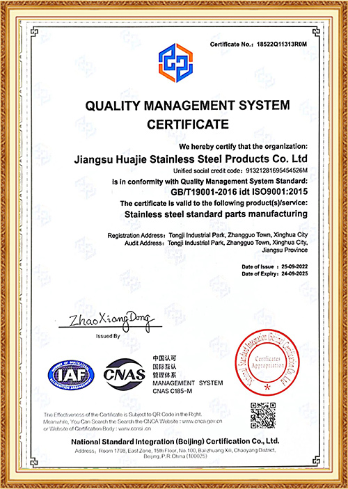 Bij Jiangsu Huajie Stainless Steel Products Co., Ltd. zijn we er trots op dat we hoogwaardige bevestigingsmiddelen leveren die niet alleen voldoen aan de internationale normen, maar deze zelfs overtreffen. Onze toewijding aan innovatie, kwaliteitsborging en klantenondersteuning maakt ons tot een vertrouwde partner voor industrieën die uitmuntendheid in bevestigingsoplossingen eisen.